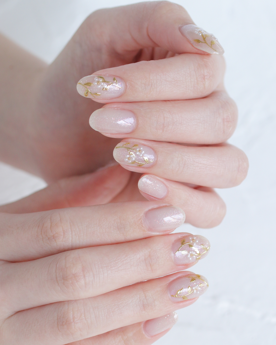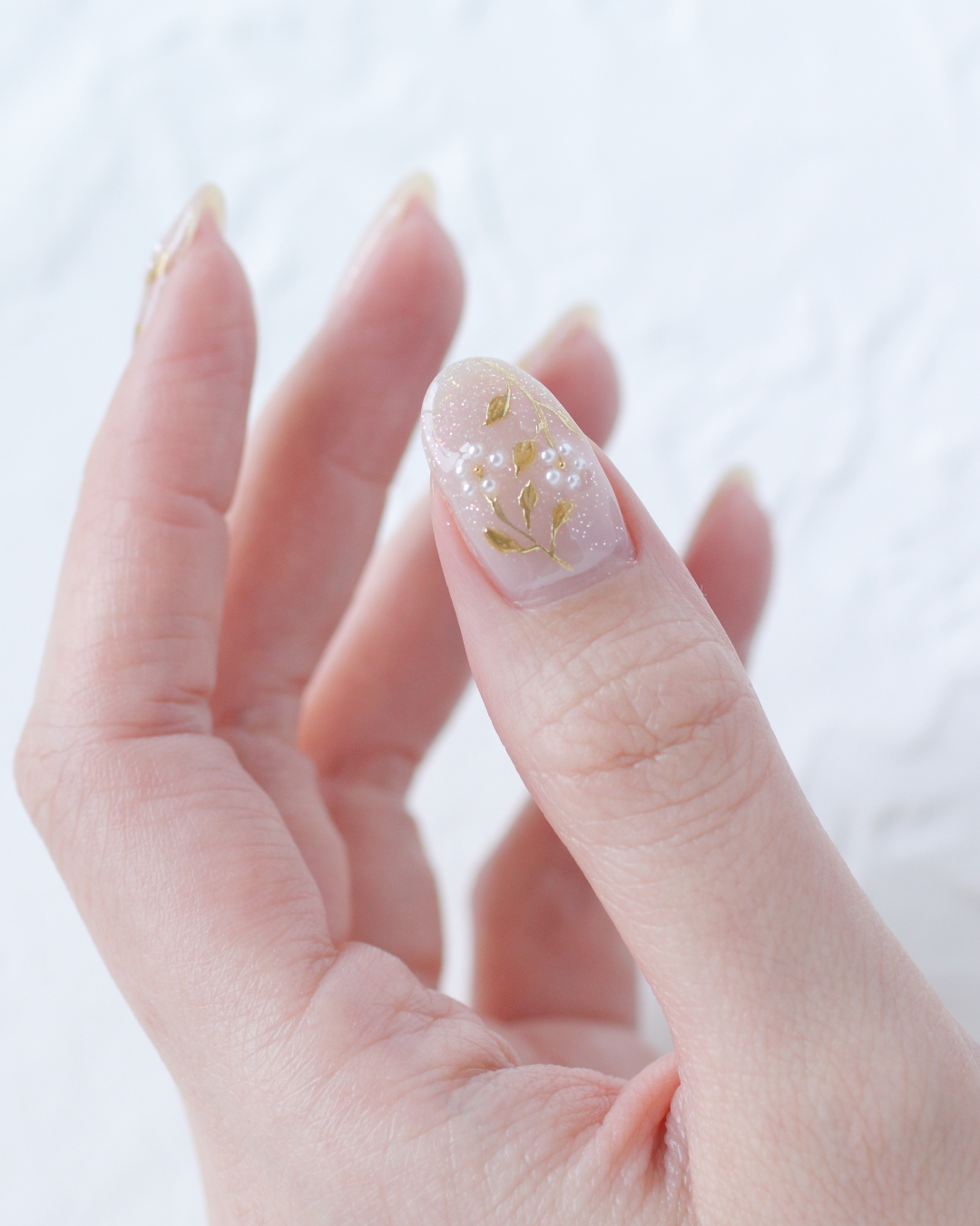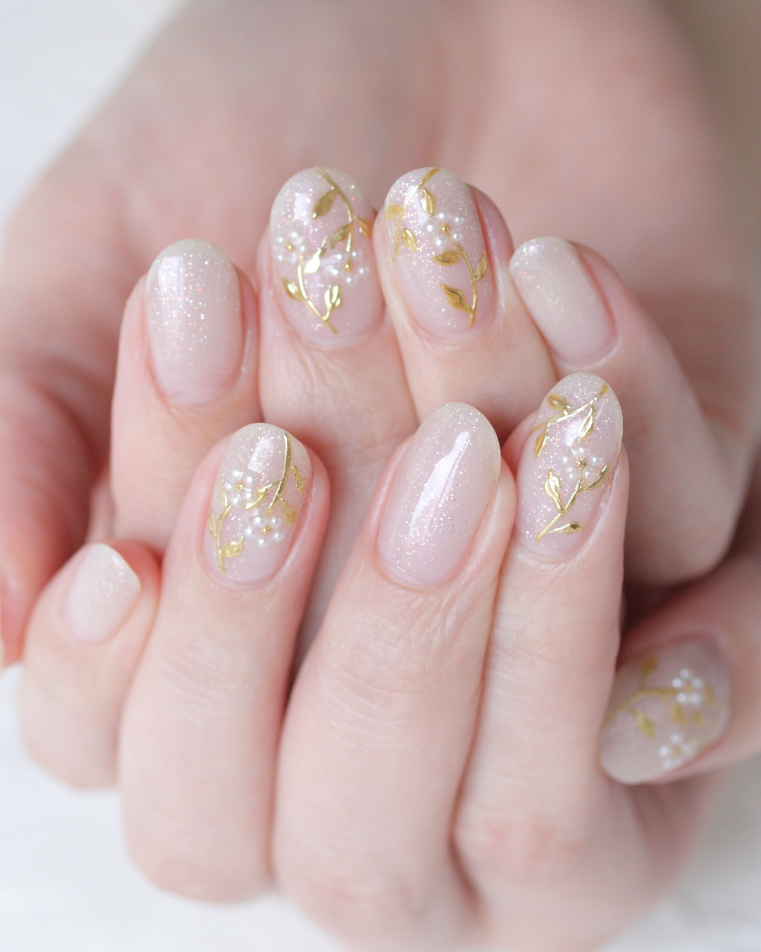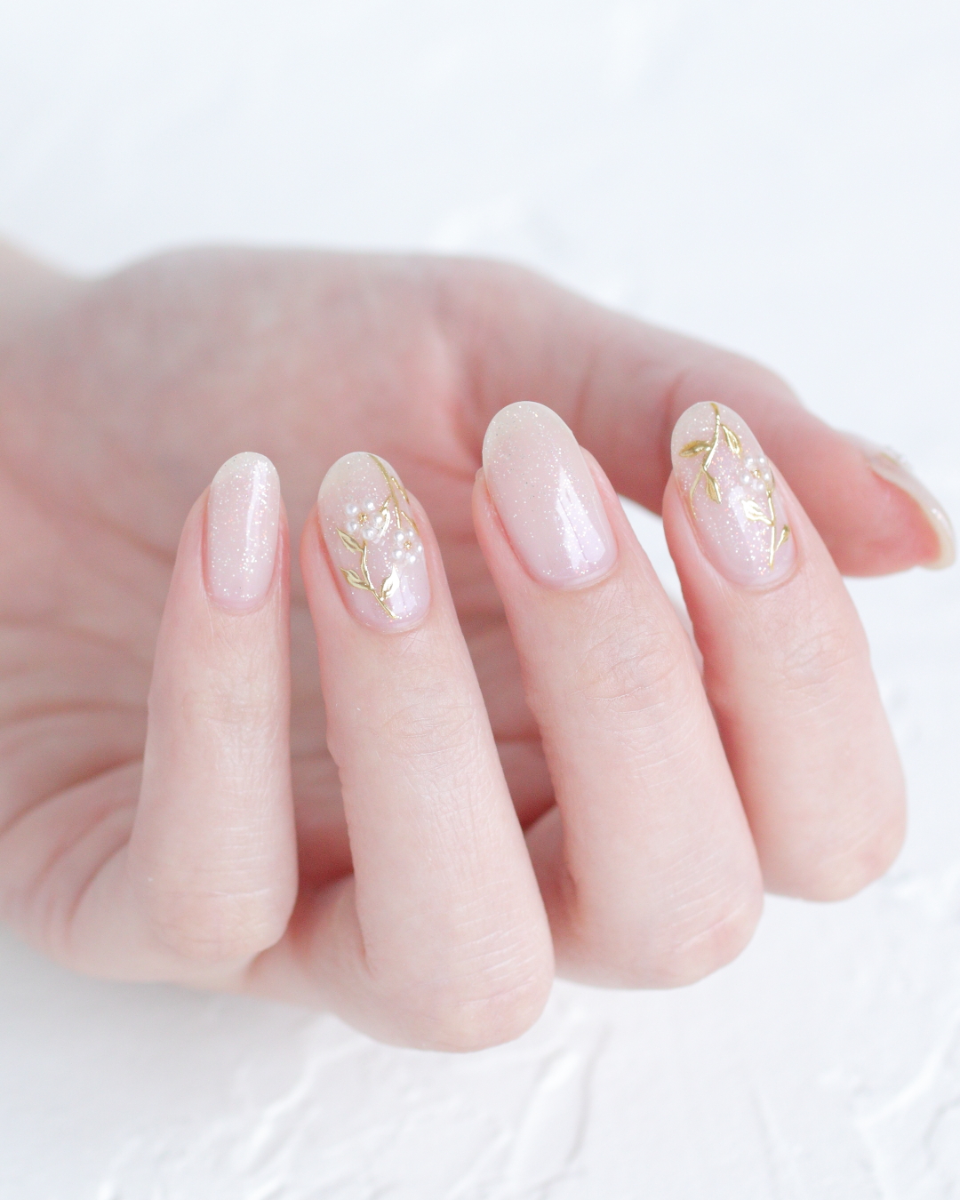 ベースカラーは、細かなラメがきらめくシャンパンベージュ。 淡い色味ながら華やかさもあり、指先を上品に見せてくれます。
