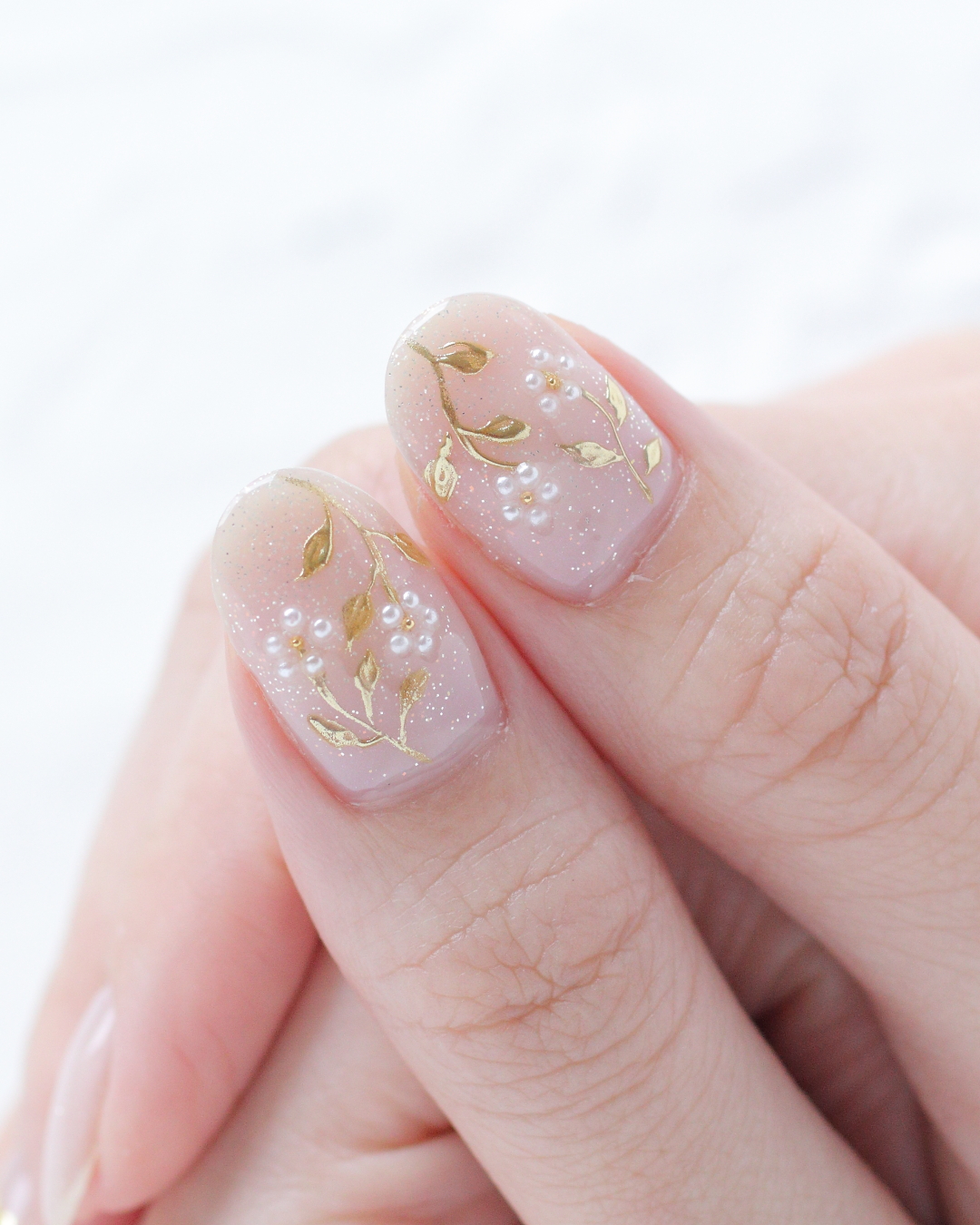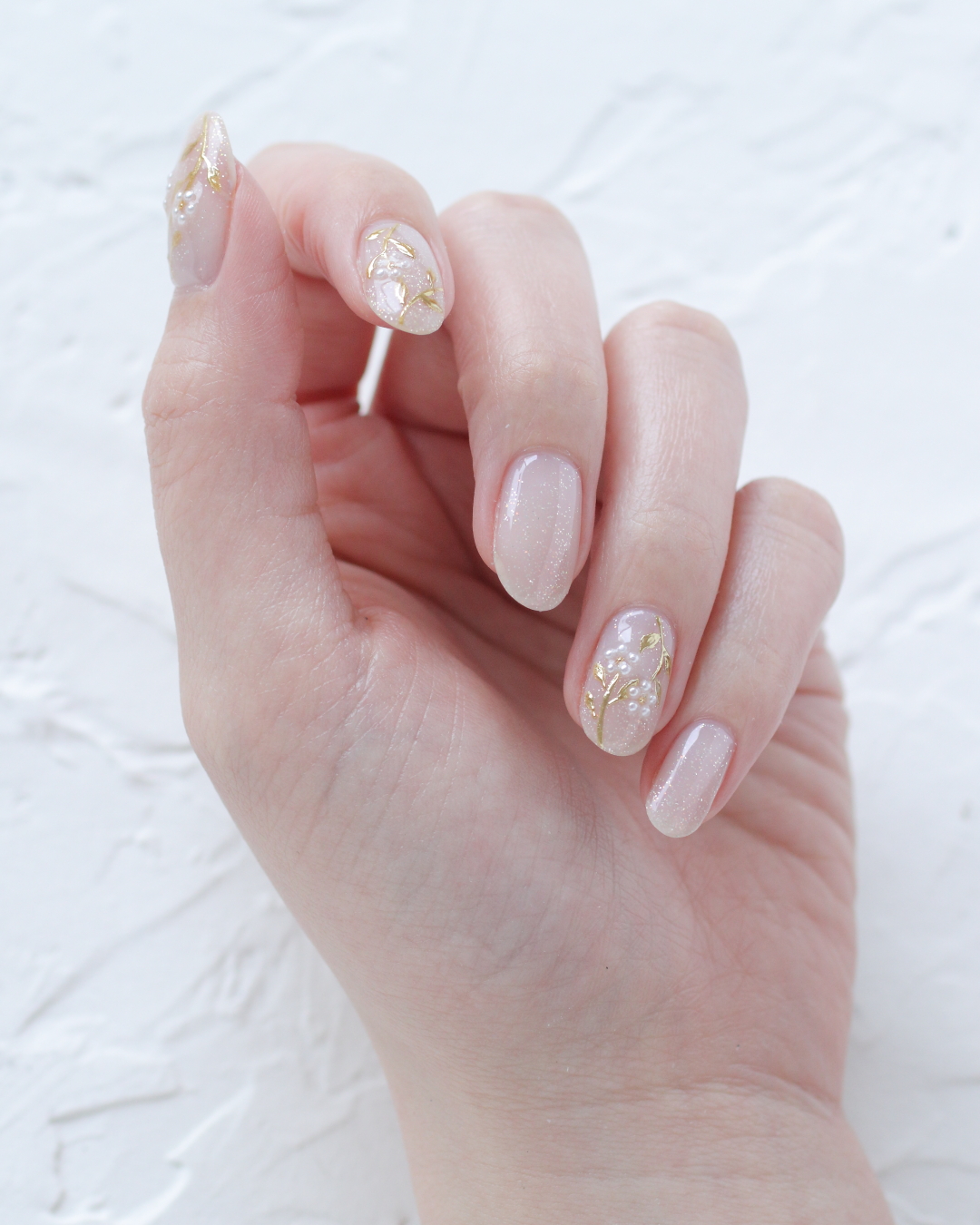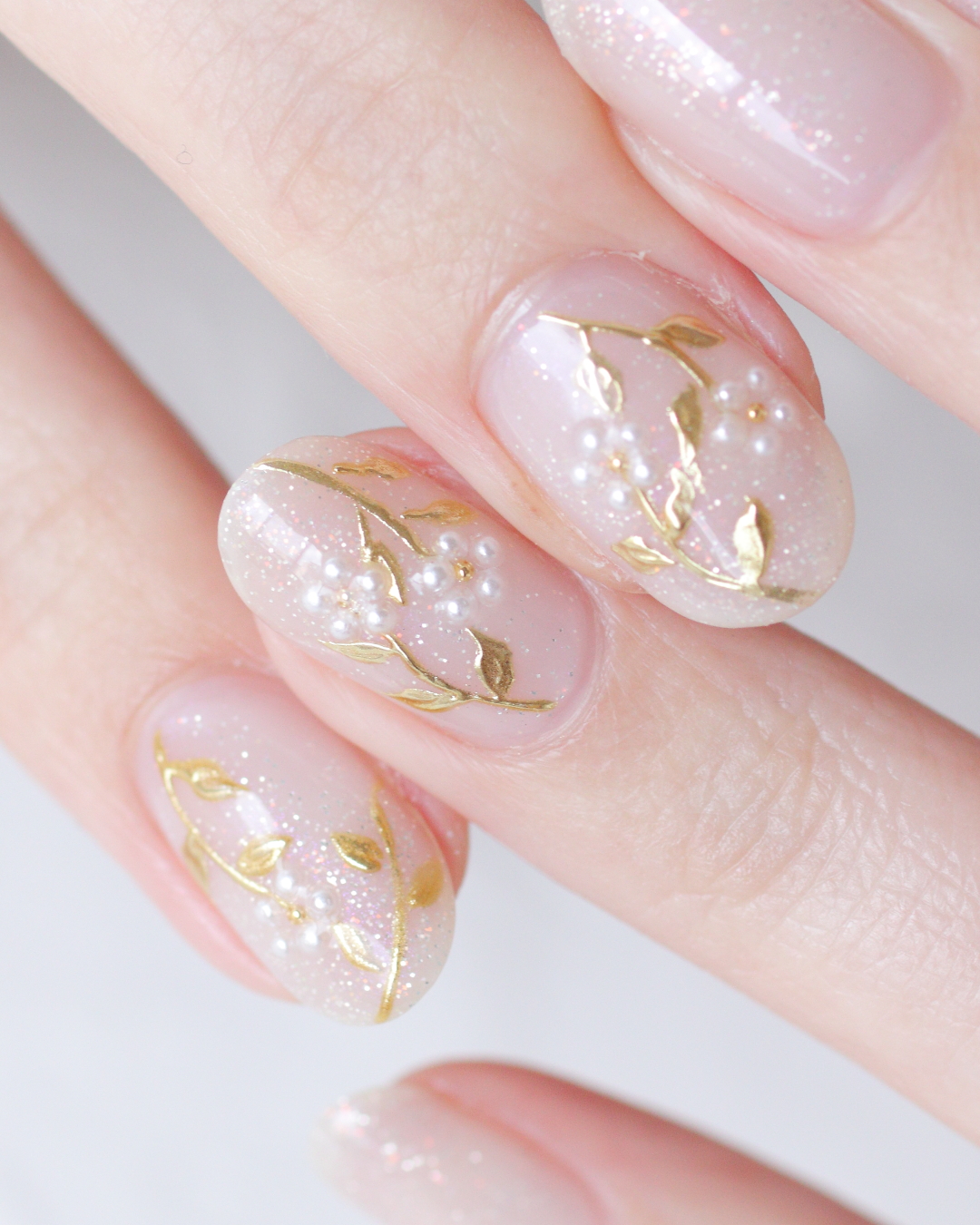 茎や葉を丁寧に描き、その上からゴールドのミラーパウダーで上品に色づけました。 花びらはパールを5粒並べて、立体感のあるフラワーに仕上げています。